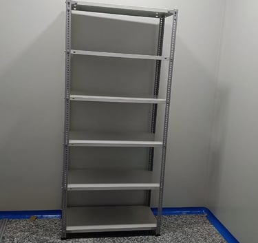 Adjustable shelves allow flexible storage for various lab or industrial items.